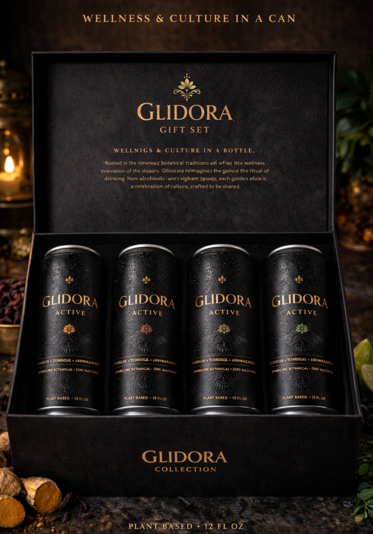 Glidora™ is a premium non-alcoholic beverage brand concept developed by STDP Studio to demonstrate how wellness, cultural influence, and elevated product design can come together to form a scalable consumer packaged goods (CPG) brand. Rooted in the traditions of the African diaspora and reimagined with a modern Black American perspective, Glidora™ offers an alcohol-free alternative for consumers seeking sophistication, balance, and intention in what they drink.